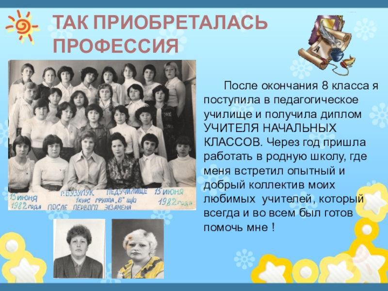 ТАК ПРИОБРЕТАЛАСЬ ПРОФЕССИЯ ПЕДАГОГА …   После окончания 8 класса я поступила в педагогическое училище и