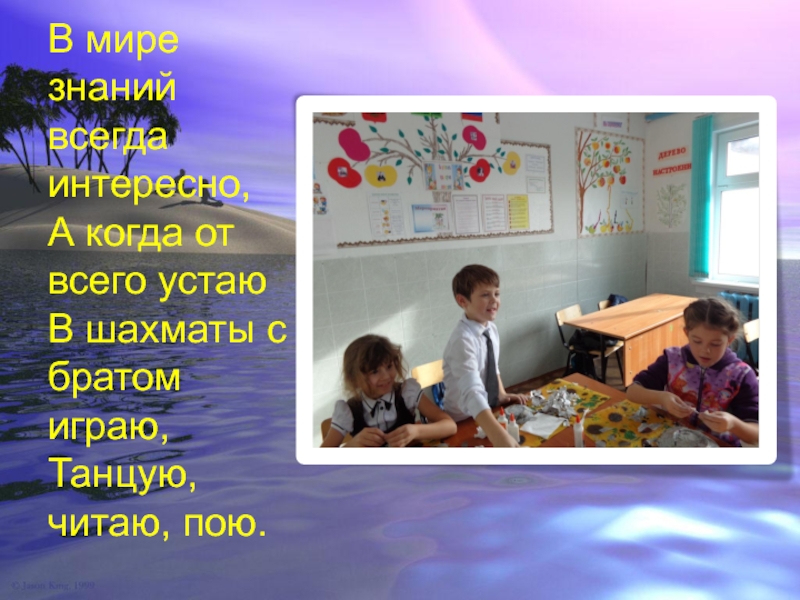 В мире знаний всегда интересно,А когда от всего устаюВ шахматы с братом играю,Танцую, читаю, пою.