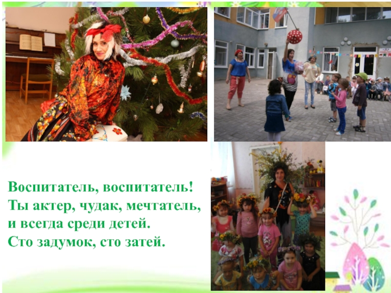 Слайд 9Воспитатель, воспитатель! Ты актер, чудак, мечтатель, и всегда среди детей. Сто задумок, сто затей.