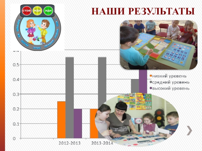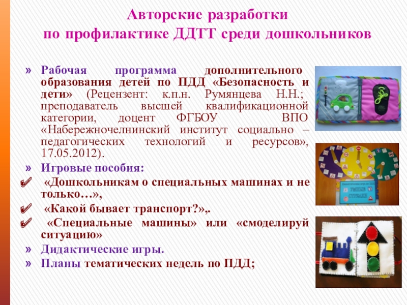 с родителями: родительский всеобуч (занятия для родителей с участием сотрудников ГИБДД), родительские собрания с приглашением инспектора ГИБДД, сотворчество родителей и воспитателей, межсемейные проекты, совместные досуги, анкетирование, консультации, беседы по предупреждению детского дорожно-транспортного травматизма, совместное составление фото и видеоматериалов, информационные «корзины».