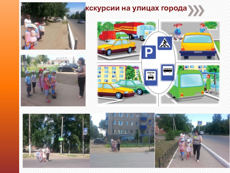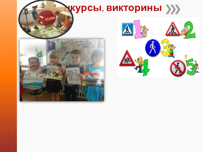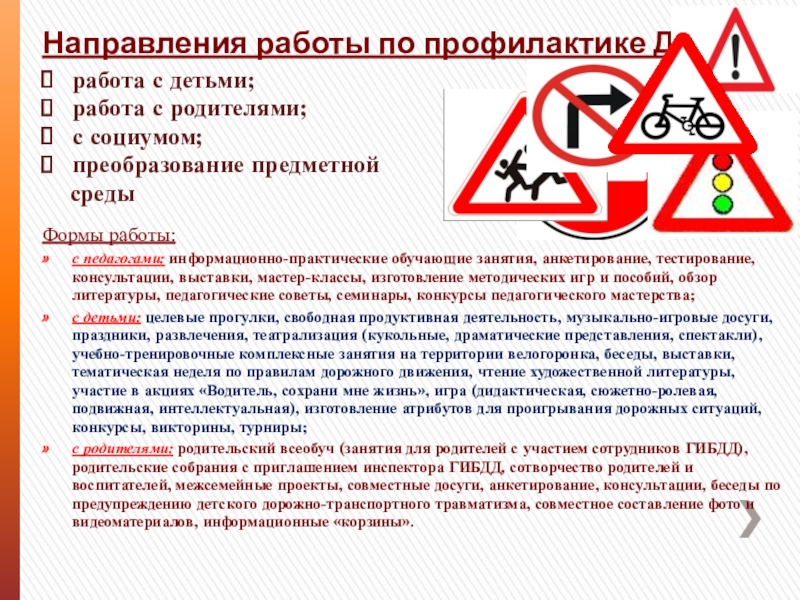 с детьми: целевые прогулки, свободная продуктивная деятельность, музыкально-игровые досуги, праздники, развлечения, театрализация (кукольные, драматические представления, спектакли), учебно-тренировочные комплексные занятия на территории велогоронка, беседы, выставки, тематическая неделя по правилам дорожного движения, чтение художественной литературы, участие в акциях «Водитель, сохрани мне жизнь», игра (дидактическая, сюжетно-ролевая, подвижная, интеллектуальная), изготовление атрибутов для проигрывания дорожных ситуаций, конкурсы, викторины, турниры;
