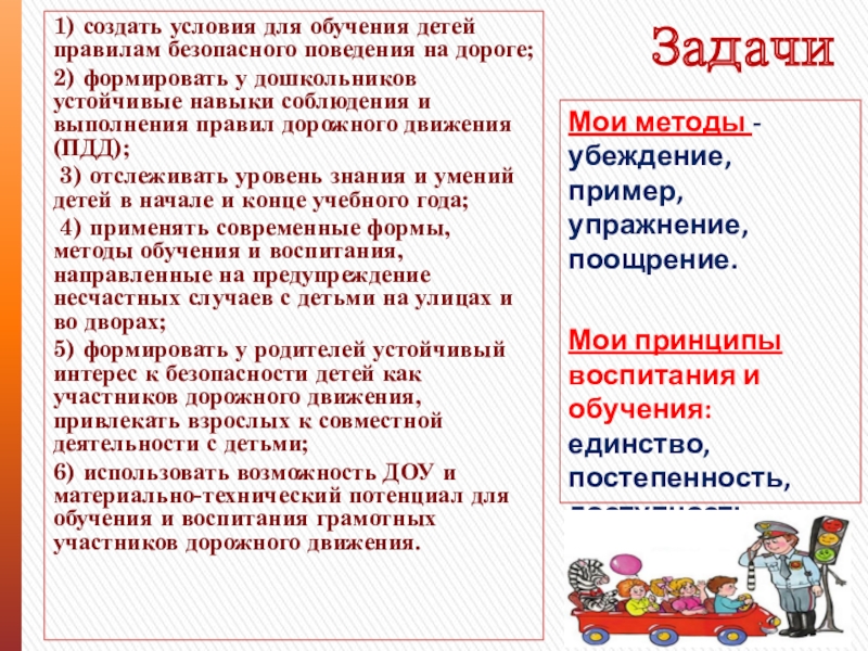 1) создать условия для обучения детей правилам безопасного поведения на дороге;