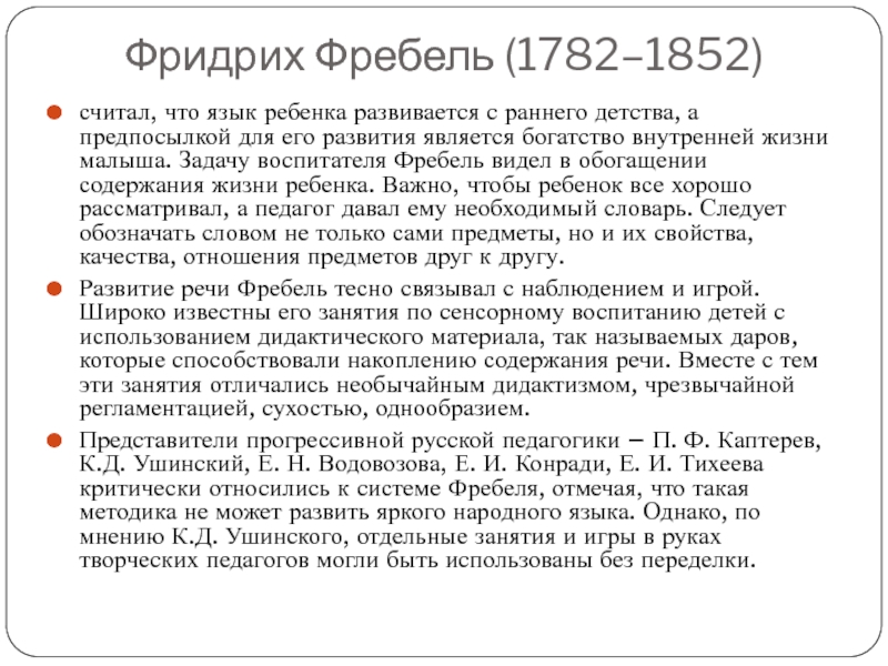 Развитие речи Фребель тесно связывал с наблюдением и игрой. Широко известны его занятия по сенсорному воспитанию детей с использованием дидактического материала, так называемых даров, которые способствовали накоплению содержания речи. Вместе с тем эти занятия отличались необычайным дидактизмом, чрезвычайной регламентацией, сухостью, однообразием.