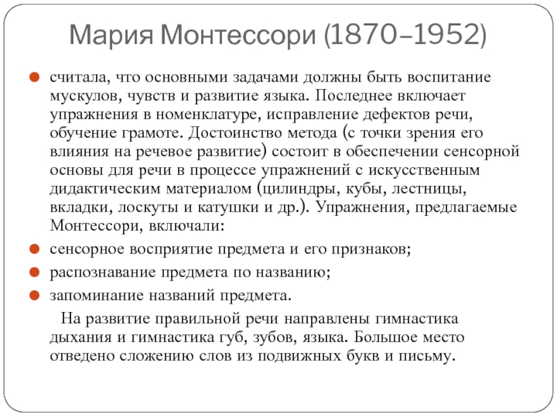 и развитие языка. Последнее включает упражнения в номенклатуре, исправление дефектов речи, обучение грамоте. Достоинство метода (с точки зрения его влияния на речевое развитие) состоит в обеспечении сенсорной основы для речи в процессе упражнений с искусственным дидактическим материалом (цилиндры, кубы, лестницы, вкладки, лоскуты и катушки и др.). Упражнения, предлагаемые Монтессори, включали: