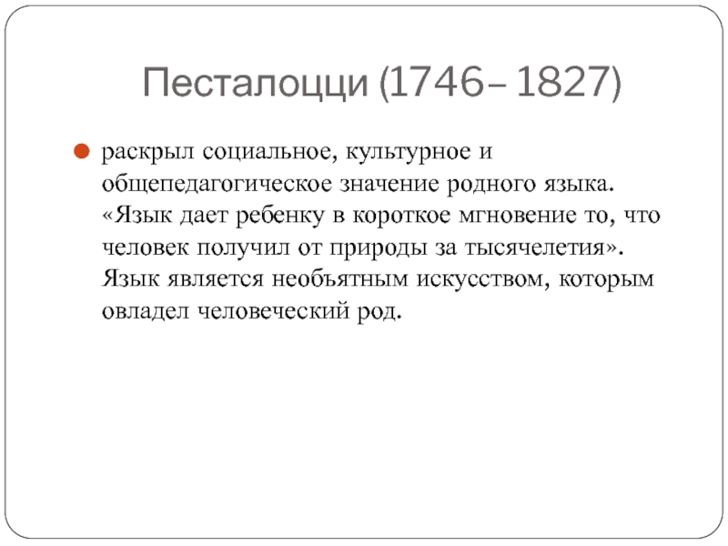 дает ребенку в короткое мгновение то, что человек получил от природы за тысячелетия». Язык является необъятным искусством, которым овладел человеческий род.