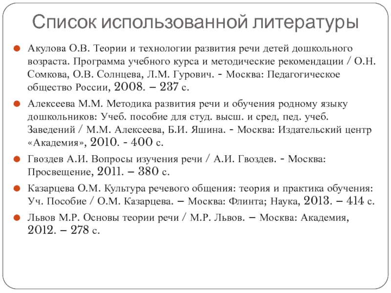 Алексеева М.М. Методика развития речи и обучения родному языку дошкольников: Учеб. пособие для студ. высш. и сред, пед. учеб. Заведений / М.М. Алексеева, Б.И. Яшина. - Москва: Издательский центр «Академия», 2010. - 400 с.