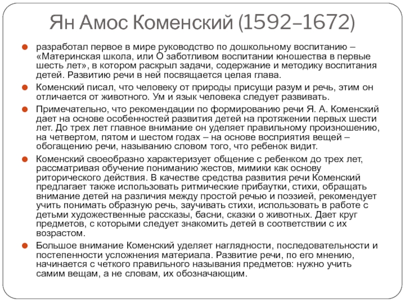 Примечательно, что рекомендации по формированию речи Я. А. Коменский дает на основе особенностей развития детей на протяжении первых шести лет. До трех лет главное внимание он уделяет правильному произношению, на четвертом, пятом и шестом годах – на основе восприятия вещей – обогащению речи, называнию словом того, что ребенок видит.