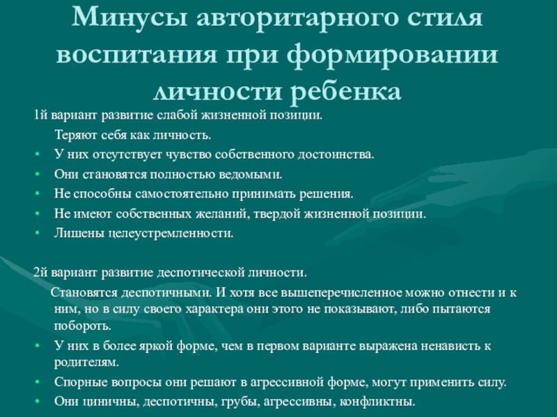 Слайд 8Минусы авторитарного стиля воспитания при формировании личности ребенка
