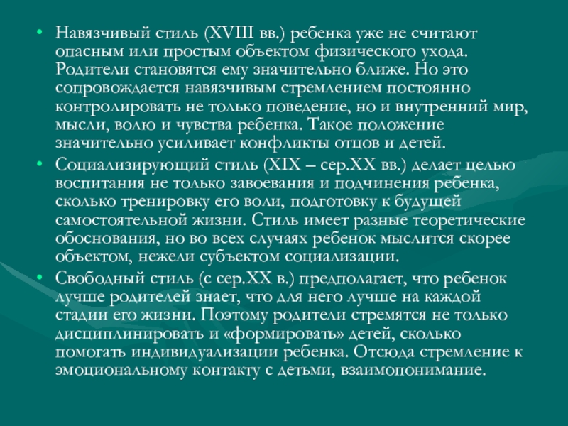 объектом физического ухода. Родители становятся ему значительно ближе. Но это сопровождается навязчивым стремлением постоянно контролировать не только поведение, но и внутренний мир, мысли, волю и чувства ребенка. Такое положение значительно усиливает конфликты отцов и детей.