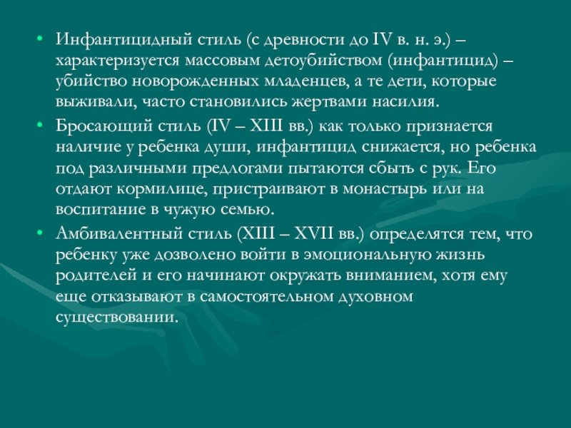 Бросающий стиль (IV – XIII вв.) как только признается наличие у ребенка души, инфантицид снижается, но ребенка под различными предлогами пытаются сбыть с рук. Его отдают кормилице, пристраивают в монастырь или на воспитание в чужую семью.