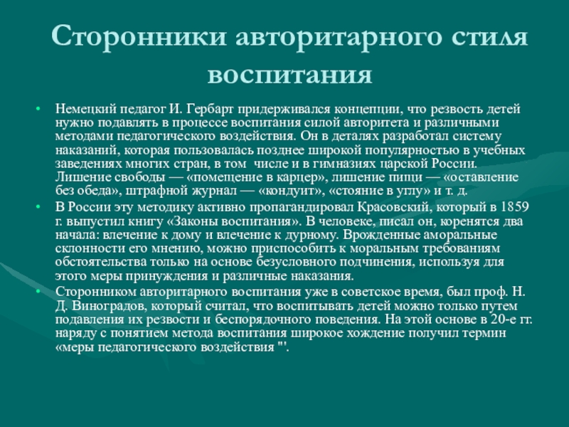 Сторонником авторитарного воспитания уже в советское время, был проф. Н.Д. Виноградов, который считал, что воспитывать детей можно только путем подавления их резвости и беспорядочного поведения. На этой основе в 20-е гг. наряду с понятием метода воспитания широкое хождение получил термин «меры педагогического воздействия "'.