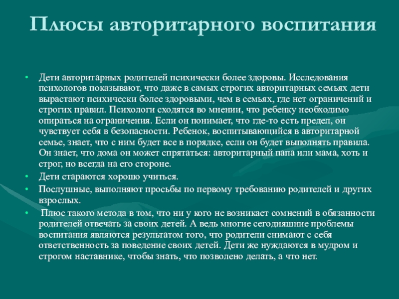 что даже в самых строгих авторитарных семьях дети вырастают психически более здоровыми, чем в семьях, где нет ограничений и строгих правил. Психологи сходятся во мнении, что ребенку необходимо опираться на ограничения. Если он понимает, что где-то есть предел, он чувствует себя в безопасности. Ребенок, воспитывающийся в авторитарной семье, знает, что с ним будет все в порядке, если он будет выполнять правила. Он знает, что дома он может спрятаться: авторитарный папа или мама, хоть и строг, но всегда на его стороне.