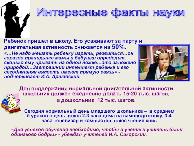 «Для успехов обучения необходимо, чтобы и ученик и учитель были одинаково бодры» - убеждал учителей И.А. Сикорский.