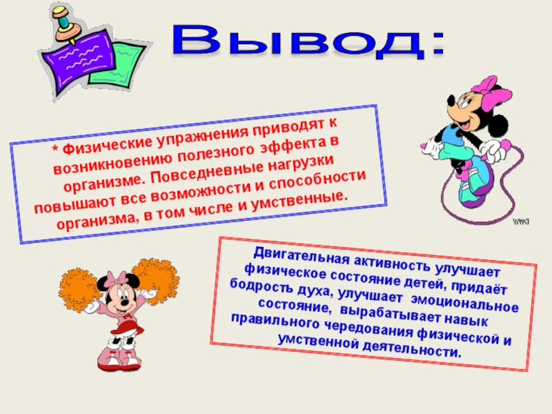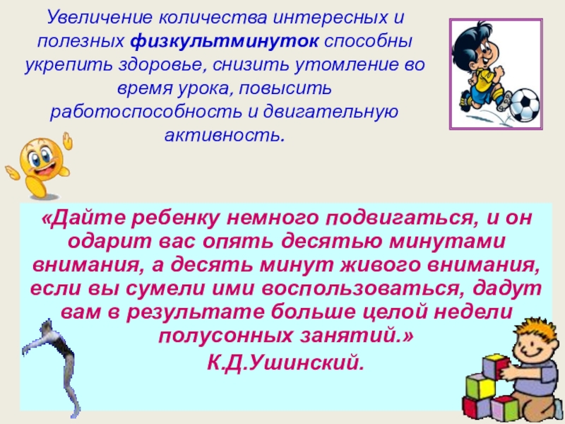 Двигательная активность улучшает физическое состояние детей, придаёт бодрость духа, улучшает эмоциональное состояние, вырабатывает навык правильного чередования физической и умственной деятельности.