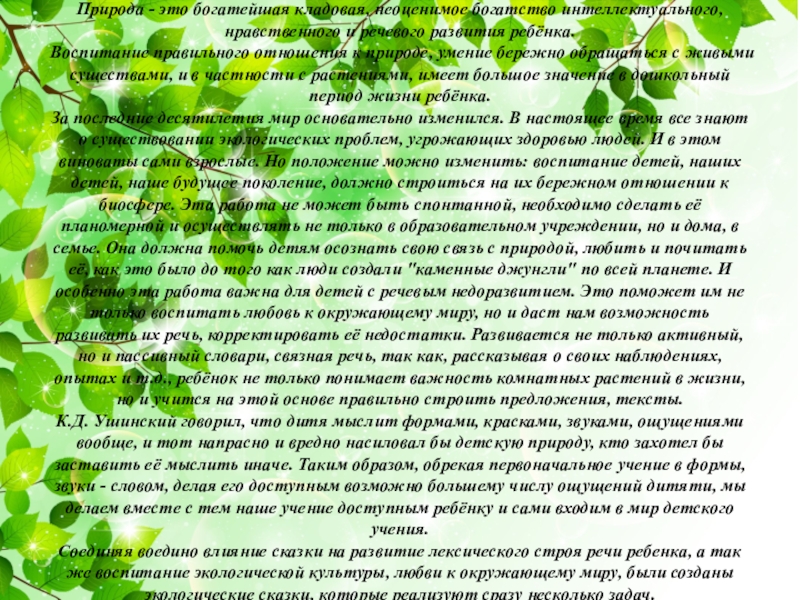 Слайд 4Природа - это богатейшая кладовая, неоценимое богатство интеллектуального, нравственного и речевого