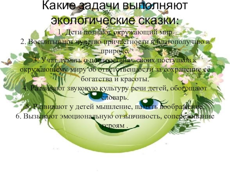 Слайд 6Какие задачи выполняют экологические сказки:
