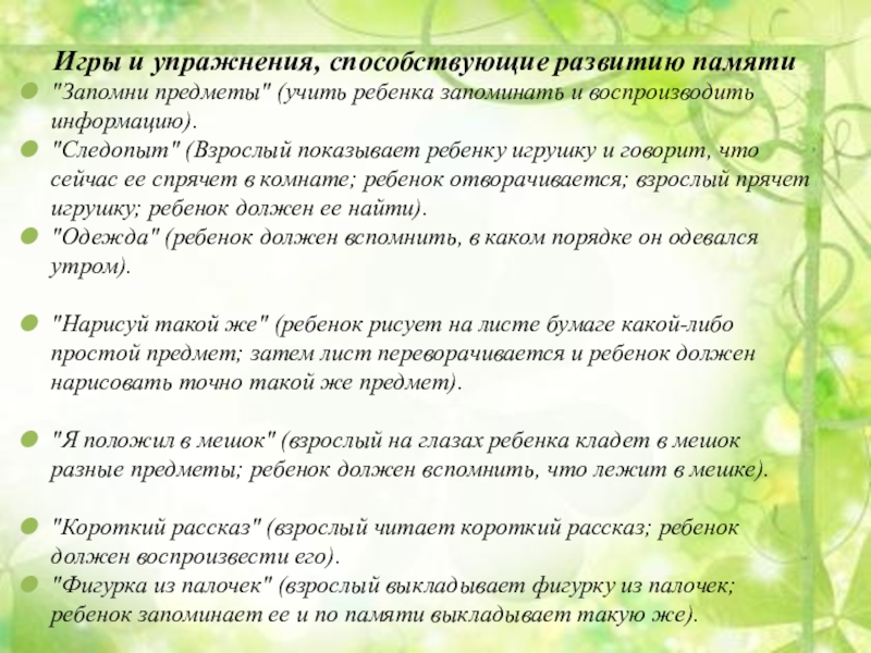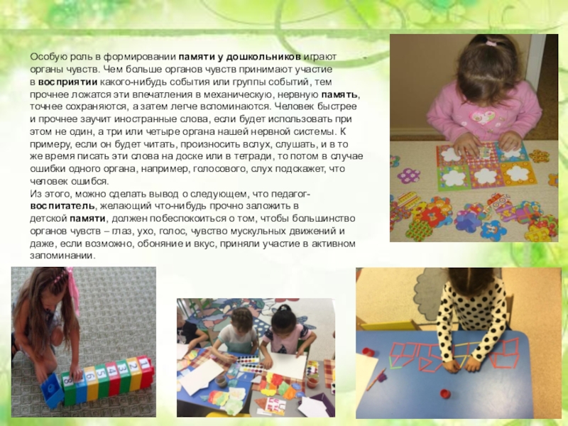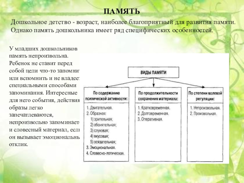 Дошкольное детство - возраст, наиболее благоприятный для развития памяти. Однако память дошкольника имеет ряд специфических особенностей.