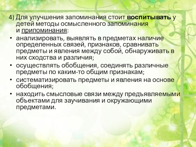 Учить детей повторять, осмысливать, связывать материал в целях запоминания, использовать связи при припоминании.