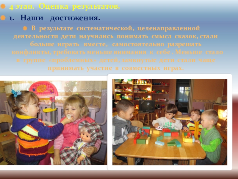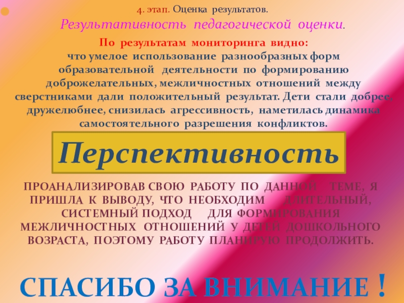 Проанализировав свою работу по данной Теме, я пришла к выводу, что необходим Длительный, системный подход Для формирования межличностных Отношений у детей дошкольного