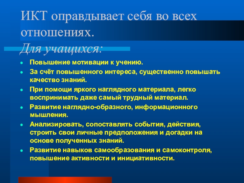 Слайд 28ИКТ оправдывает себя во всех отношениях.