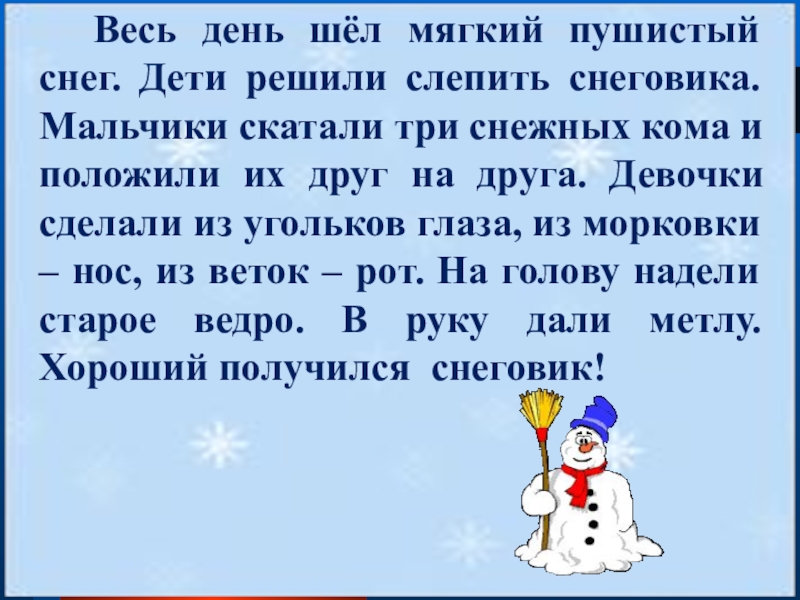 Мальчики скатали три снежных кома и положили их друг на друга. Девочки сделали из угольков глаза, из морковки – нос, из веток – рот. На голову надели старое ведро. В руку дали метлу. Хороший получился снеговик!