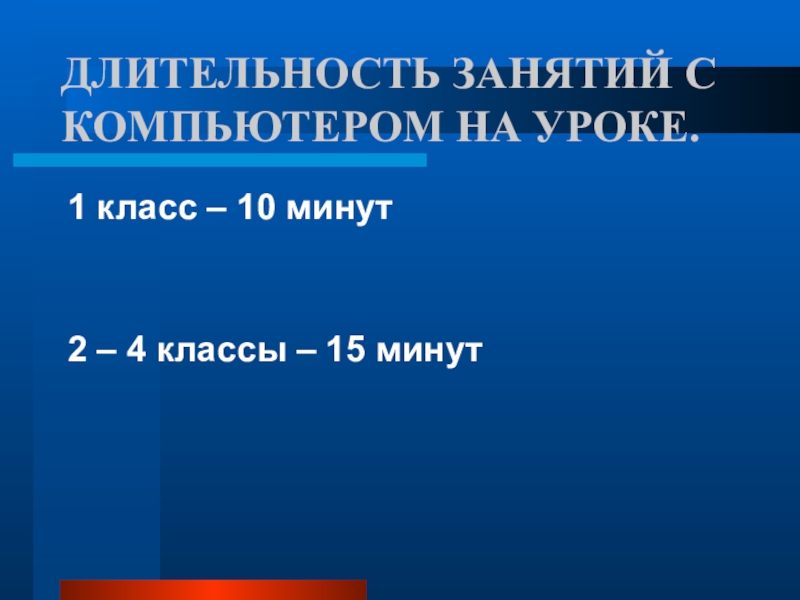 Слайд 9ДЛИТЕЛЬНОСТЬ ЗАНЯТИЙ С КОМПЬЮТЕРОМ НА УРОКЕ.