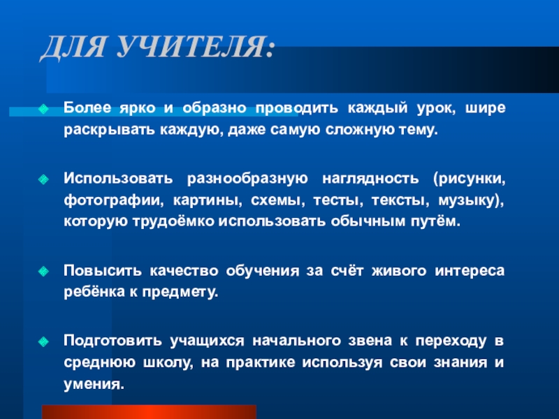 Использовать разнообразную наглядность (рисунки, фотографии, картины, схемы, тесты, тексты, музыку), которую трудоёмко использовать обычным путём.