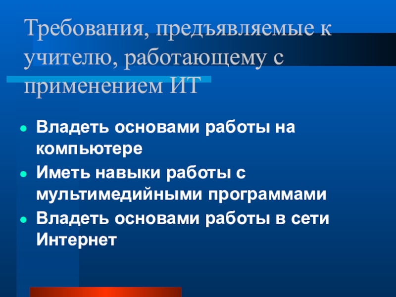 Слайд 6Требования, предъявляемые к учителю, работающему с применением ИТ