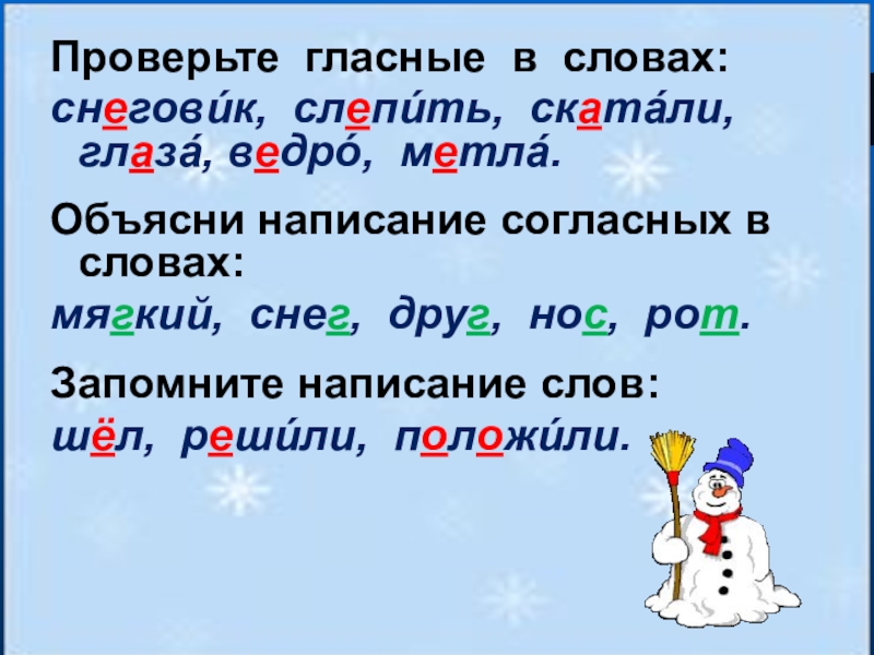 снеговúк, слепúть, скатáли, глазá, ведрó, метлá.