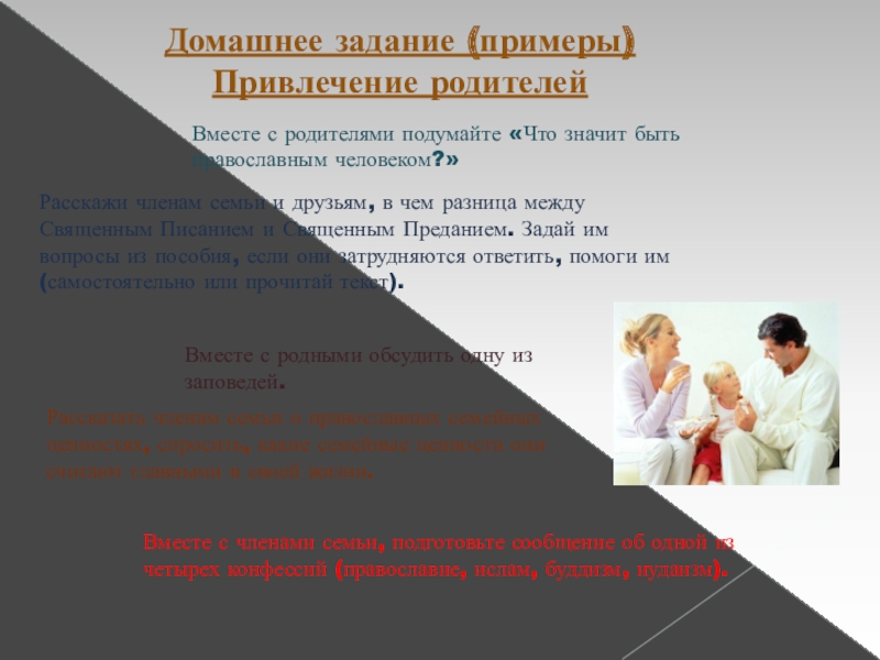 Вместе с членами семьи, подготовьте сообщение об одной из четырех конфессий (православие, ислам, буддизм, иудаизм).
