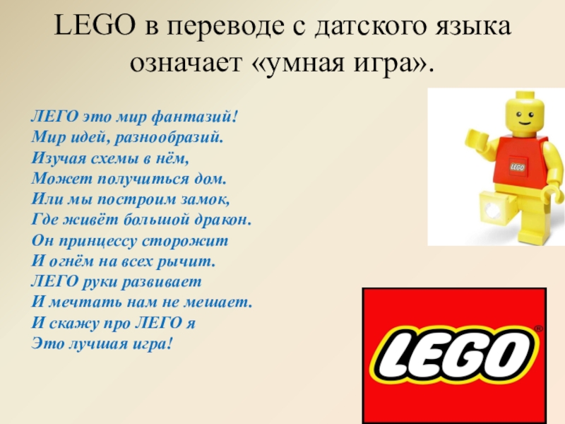 Слайд 3LEGO в переводе с датского языка означает «умная игра».