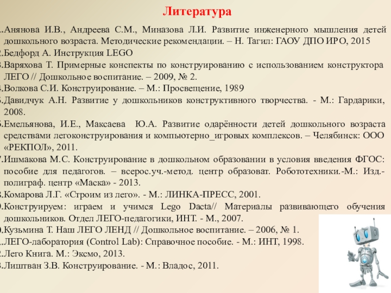 23. Селезнёва Г.А. Сборник материалов центр развивающих игр Леготека в ГОУ центр образования № 1317 – М., 2007г