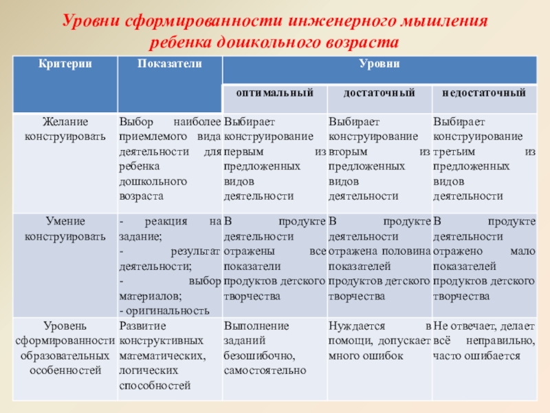 Слайд 14Уровни сформированности инженерного мышления ребенка дошкольного возраста