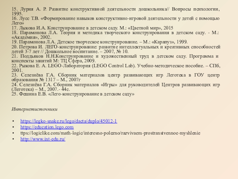 20. Петрова И. ЛЕГО-конструирование: развитие интеллектуальных и креативных способностей детей 3-7 лет // Дошкольное воспитание. – 2007, № 10.