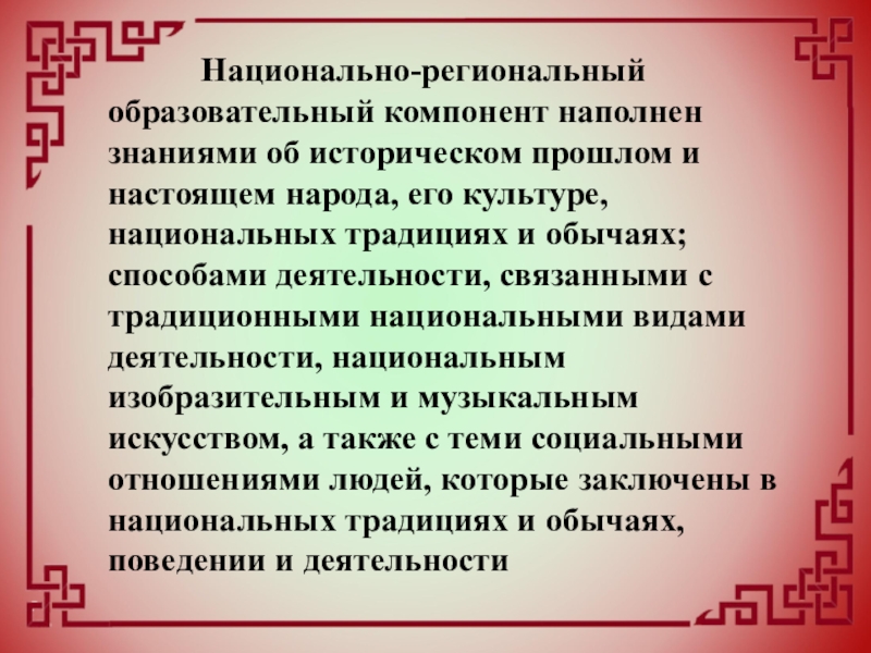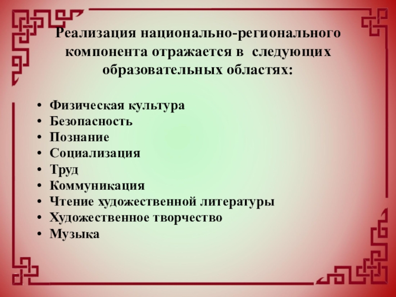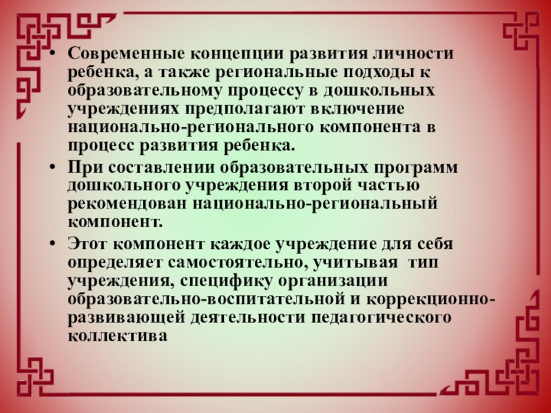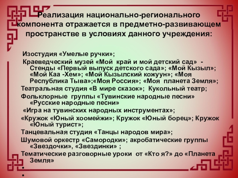Реализация национально-регионального компонента отражается в предметно-развивающем пространстве в условиях данного учреждения: