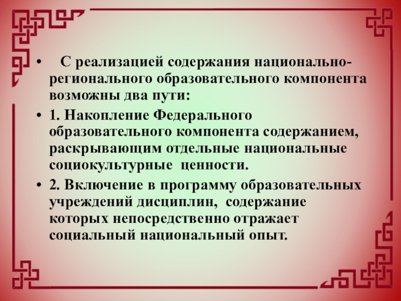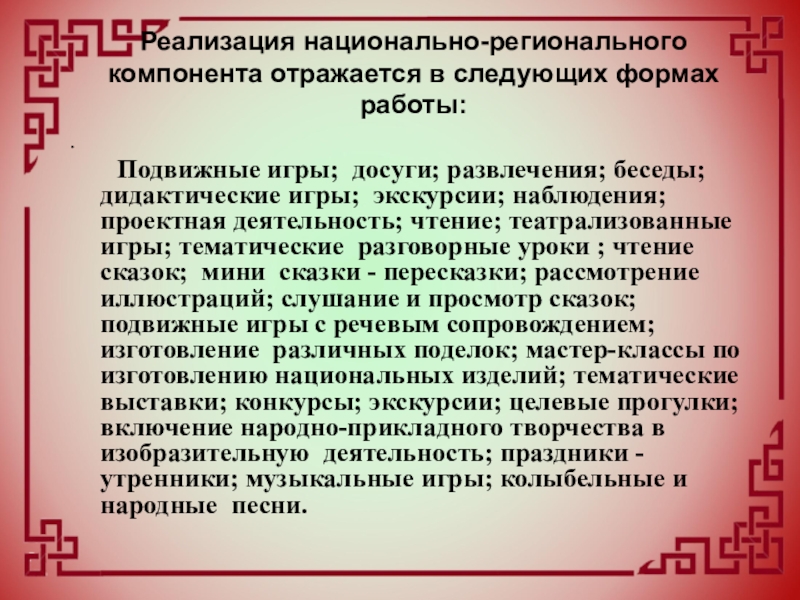 Реализация национально-регионального компонента отражается в следующих формах работы: