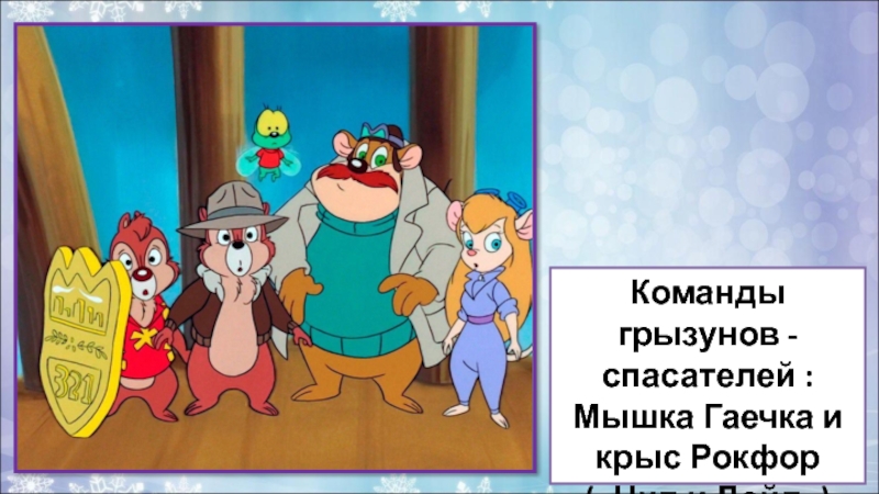 Слайд 13Команды грызунов - спасателей : Мышка Гаечка и крыс Рокфор («Чип