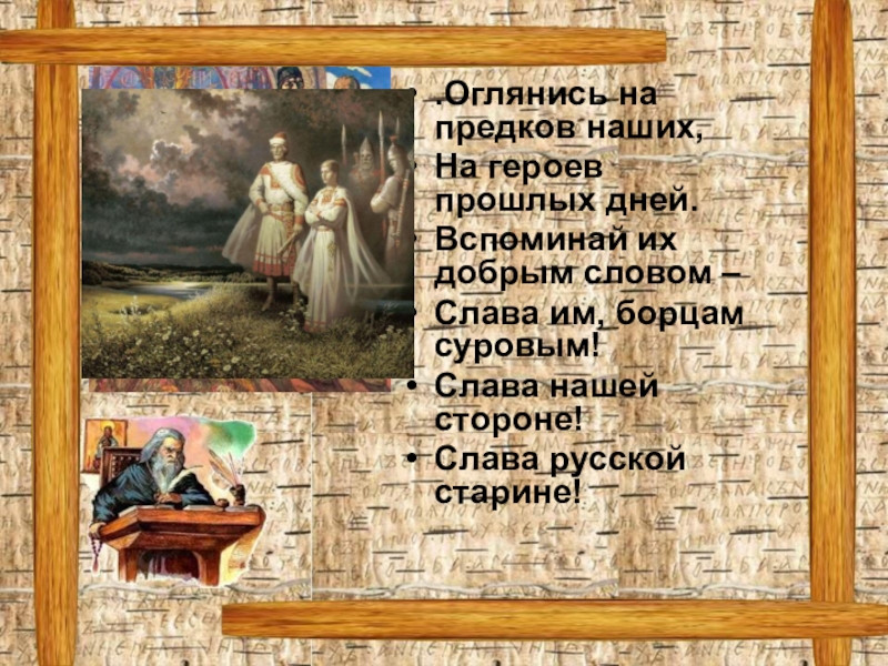 .Оглянись на предков наших,На героев прошлых дней.Вспоминай их добрым словом – Слава им, борцам суровым!Слава нашей стороне!Слава русской старине!