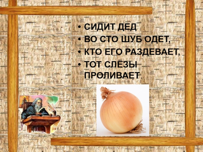 СИДИТ ДЕД ВО СТО ШУБ ОДЕТ,КТО ЕГО РАЗДЕВАЕТ, ТОТ СЛЁЗЫ ПРОЛИВАЕТ.