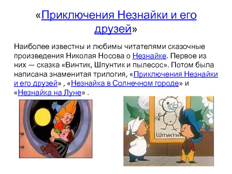 Николая Носова о Незнайке. Первое из них — сказка «Винтик, Шпунтик и пылесос». Потом была написана знаменитая трилогия, «Приключения Незнайки и его друзей» , «Незнайка в Солнечном городе» и «Незнайка на Луне» .