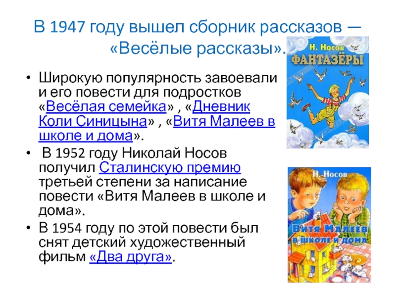 и его повести для подростков «Весёлая семейка» , «Дневник Коли Синицына» , «Витя Малеев в школе и дома».