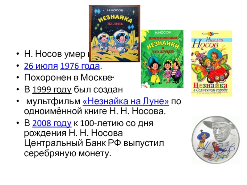 Слайд 12Н. Носов умер в Москве