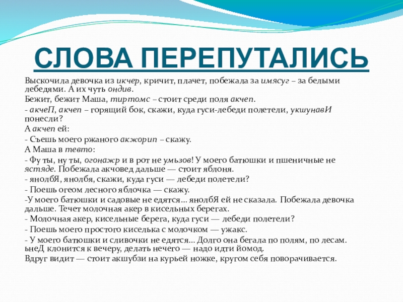 - акчеП, акчеп – горящий бок, скажи, куда гуси-лебеди полетели, укшунавИ понесли?