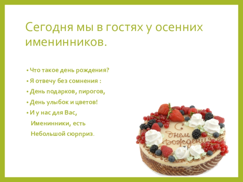 Сегодня мы в гостях у осенних именинников.Что такое день рождения?Я отвечу без сомнения :День подарков, пирогов,День улыбок и цветов!И у нас для Вас, Именинники, есть Небольшой сюрприз.