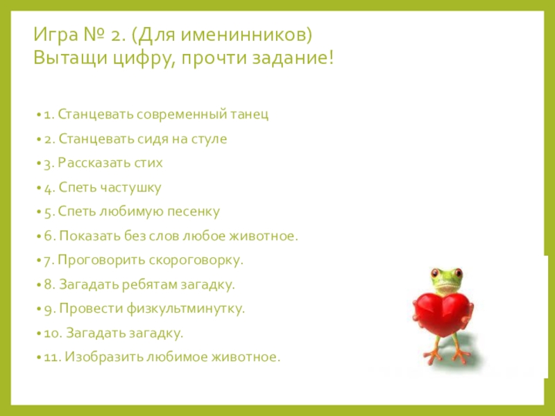 Слайд 12Игра № 2. (Для именинников) Вытащи цифру, прочти задание!