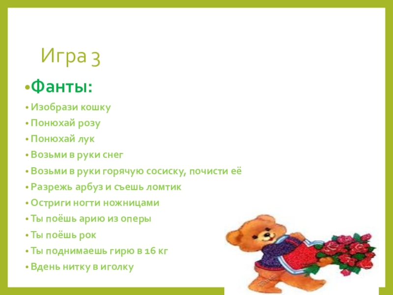 Игра 3Фанты:Изобрази кошкуПонюхай розуПонюхай лукВозьми в руки снегВозьми в руки горячую сосиску, почисти еёРазрежь арбуз и съешь