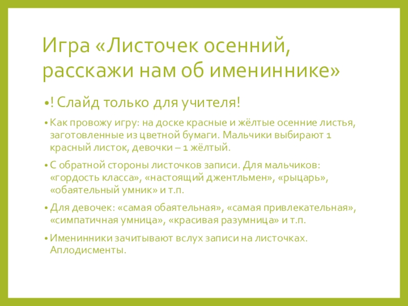 Игра «Листочек осенний, расскажи нам об имениннике»! Слайд только для учителя!Как провожу игру: на доске красные и