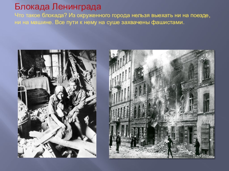 Блокада Ленинграда  Что такое блокада? Из окруженного города нельзя выехать ни на поезде, ни на машине.