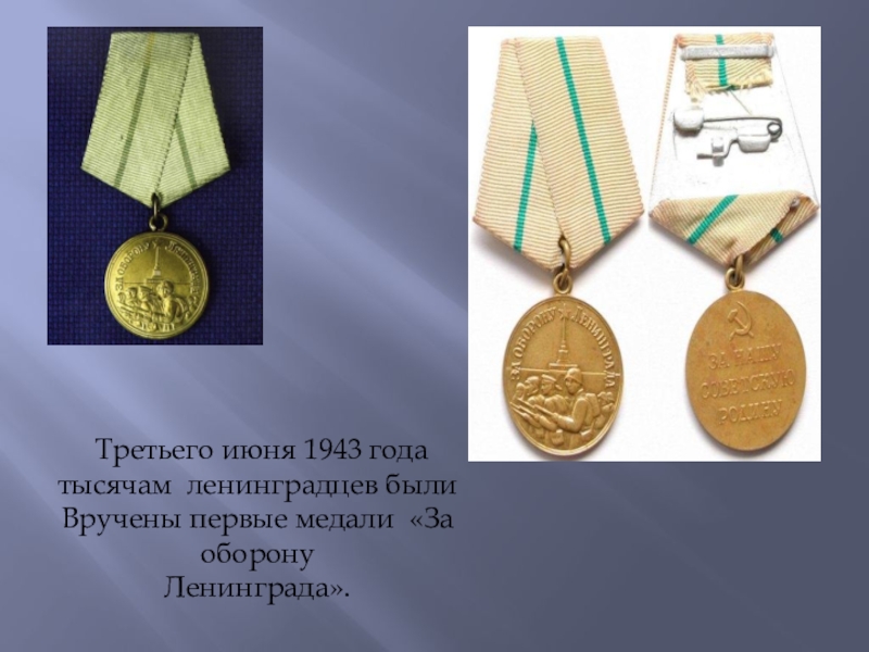 Третьего июня 1943 года тысячам ленинградцев былиВручены первые медали «За оборонуЛенинграда».
