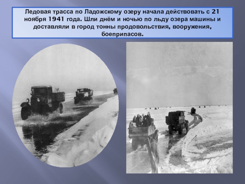 Ледовая трасса по Ладожскому озеру начала действовать с 21 ноября 1941 года. Шли днём и ночью по